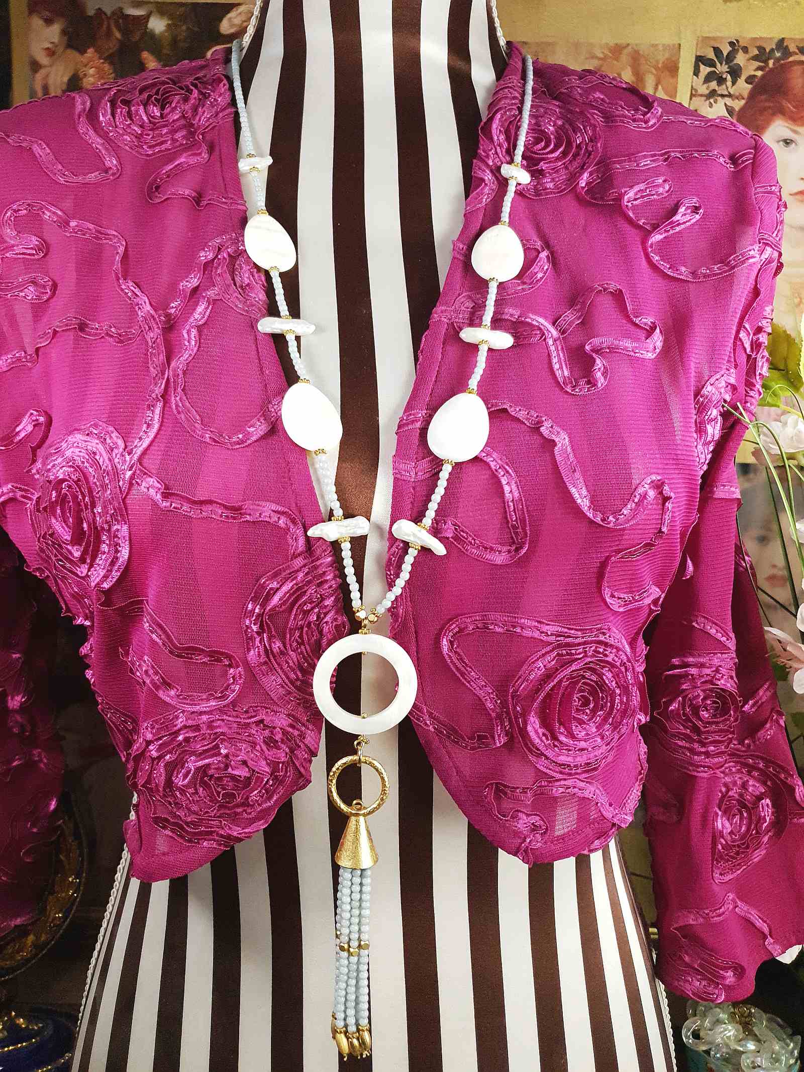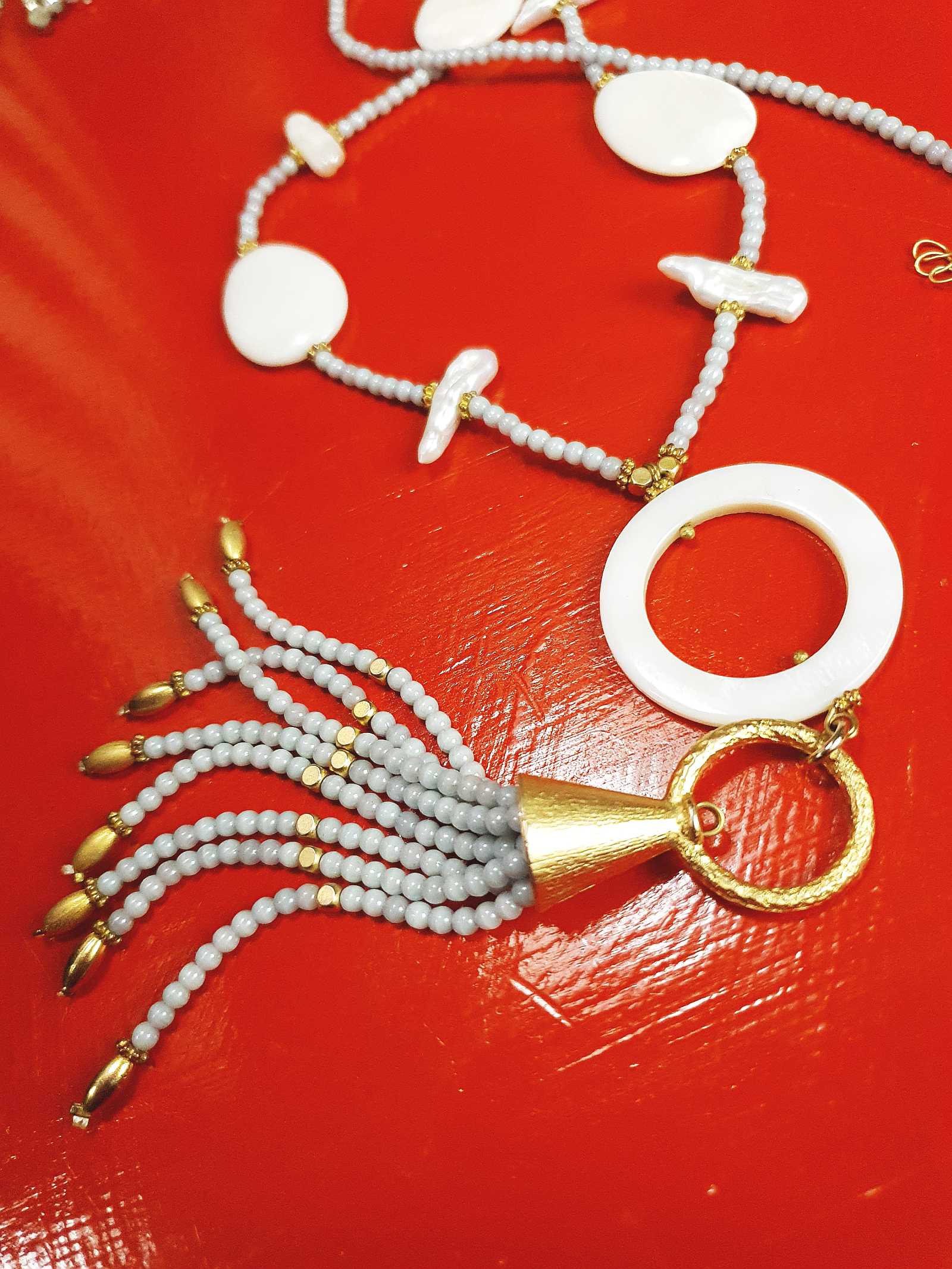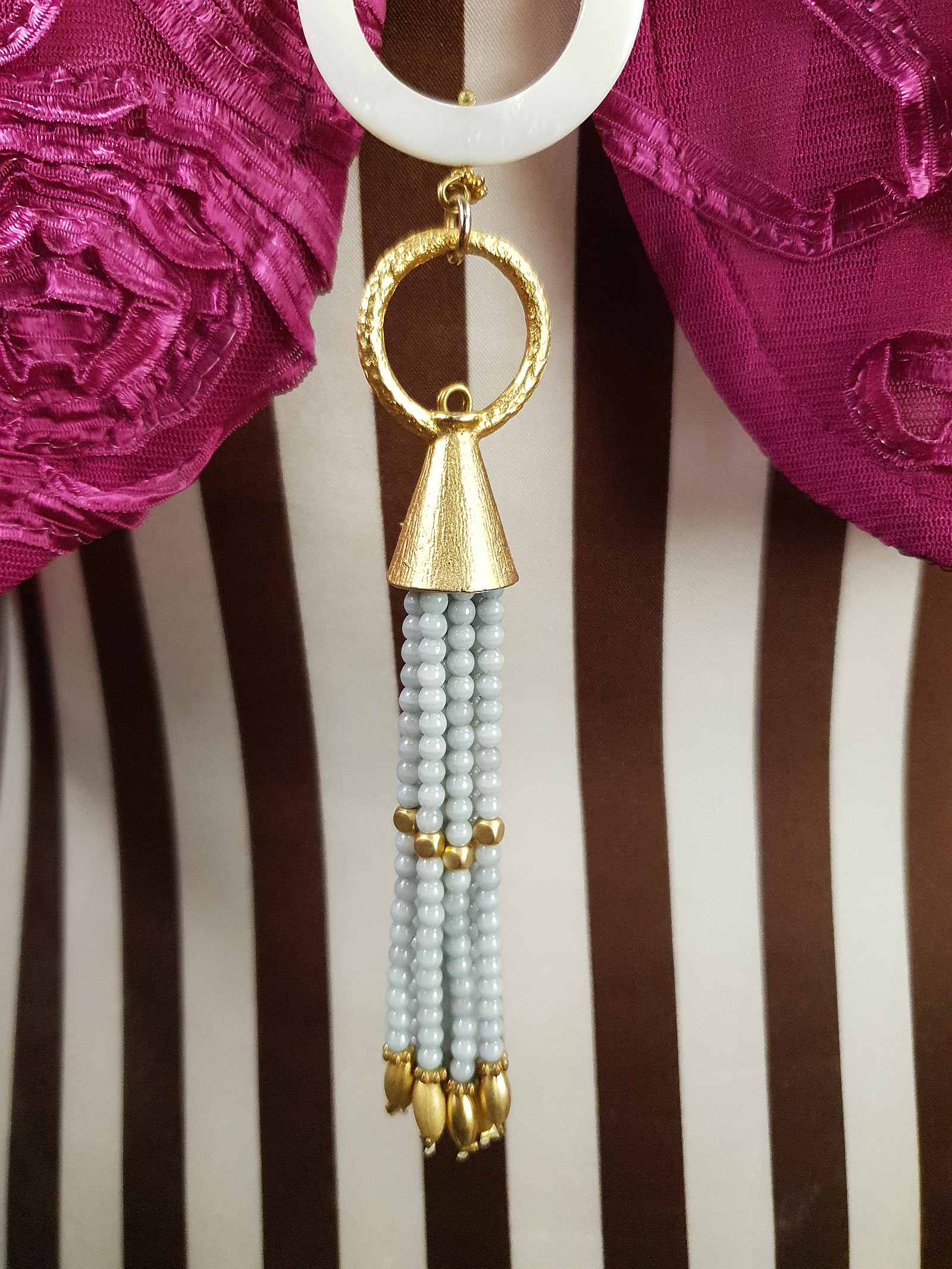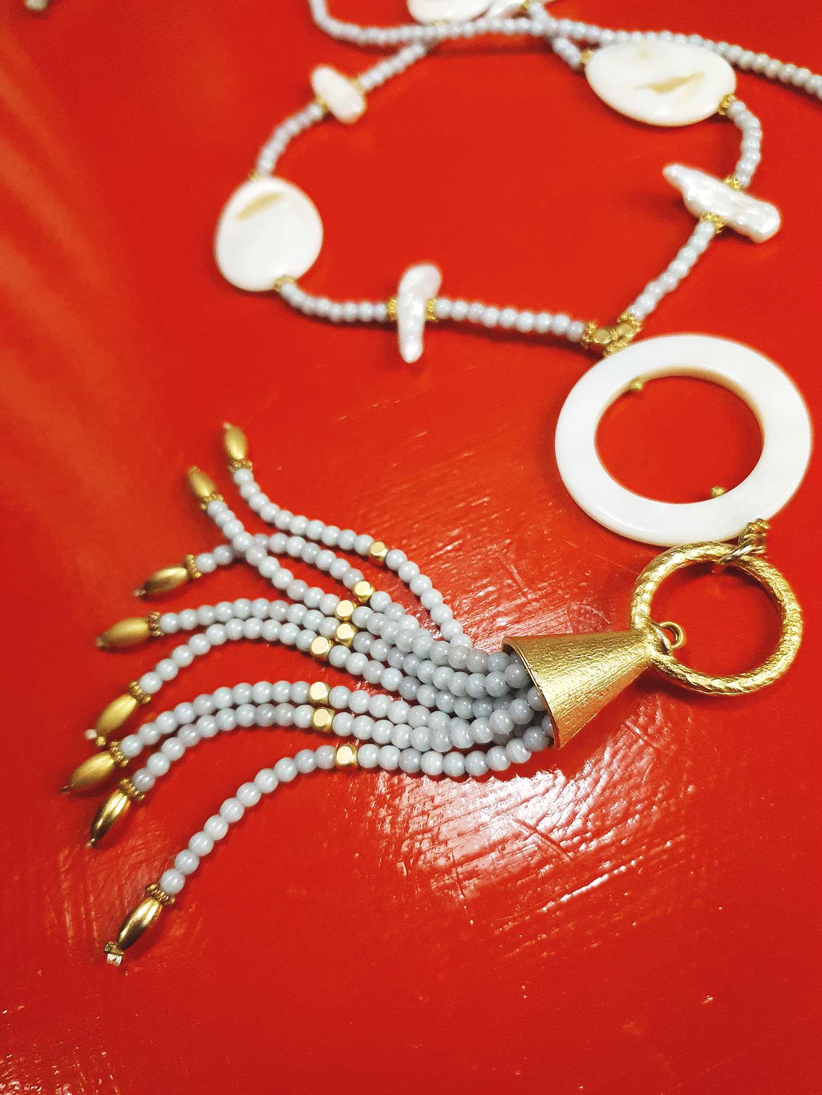 A captivating Y2K vintage necklace crafted with pale blue glass seed pearls, interspersed with uniquely shaped, luminous white baroque pearls and iridescent teardrop mother of pearl beads with natural golden inclusions. Matte gold-tone metal bead caps enhance the design's elegance. The necklace features a mother-of-pearl circular pendant, finished with a flowing strand pendant. Lobster claw clasp fastening with extender. This iridescent necklace captures the essence of the early 2000s.