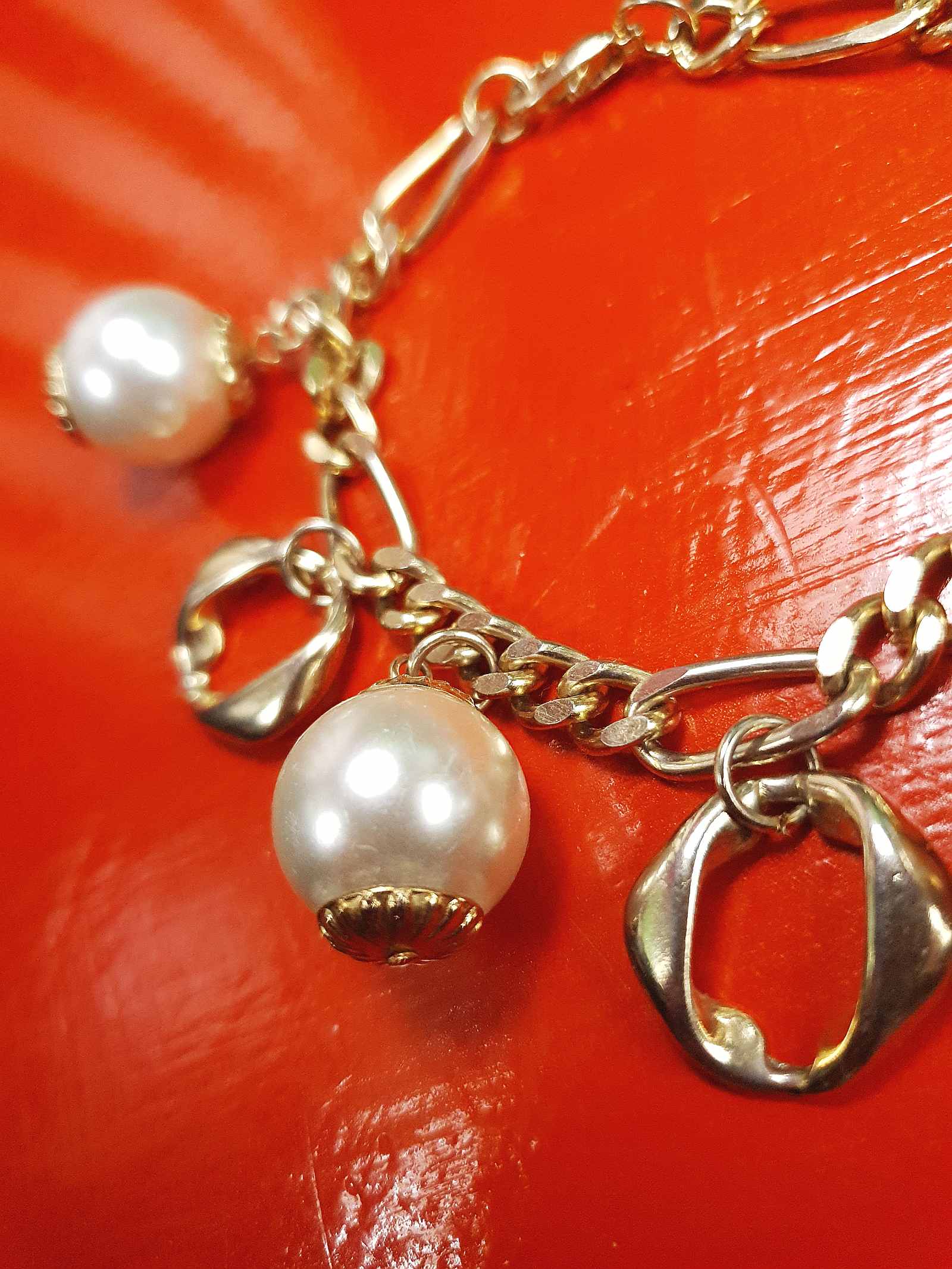 This 90s vintage bracelet showcases a gold-tone metal curb link chain supporting large luminous white glass pearls, beautifully capped with detailed gold-tone metal floral designs. The bracelet also features circular charms with a subtle twisted detail. Finished with a lobster claw clasp fastening. The perfect cool 90s statement bracelet.