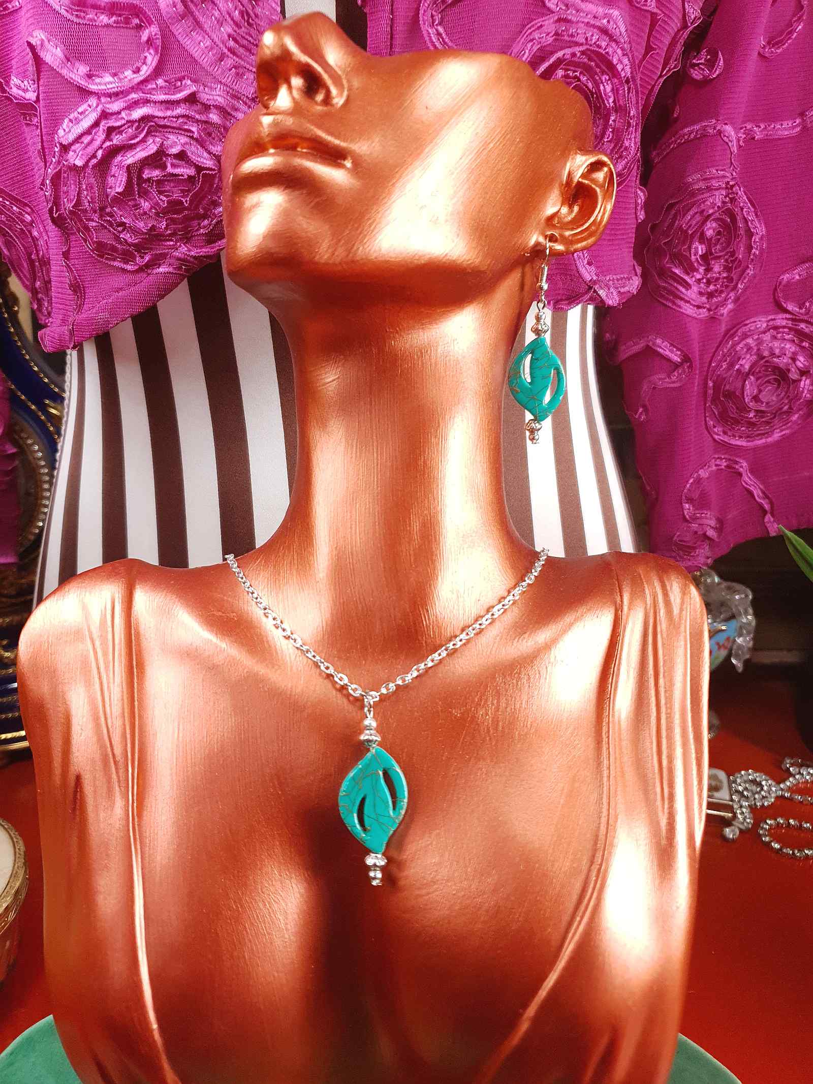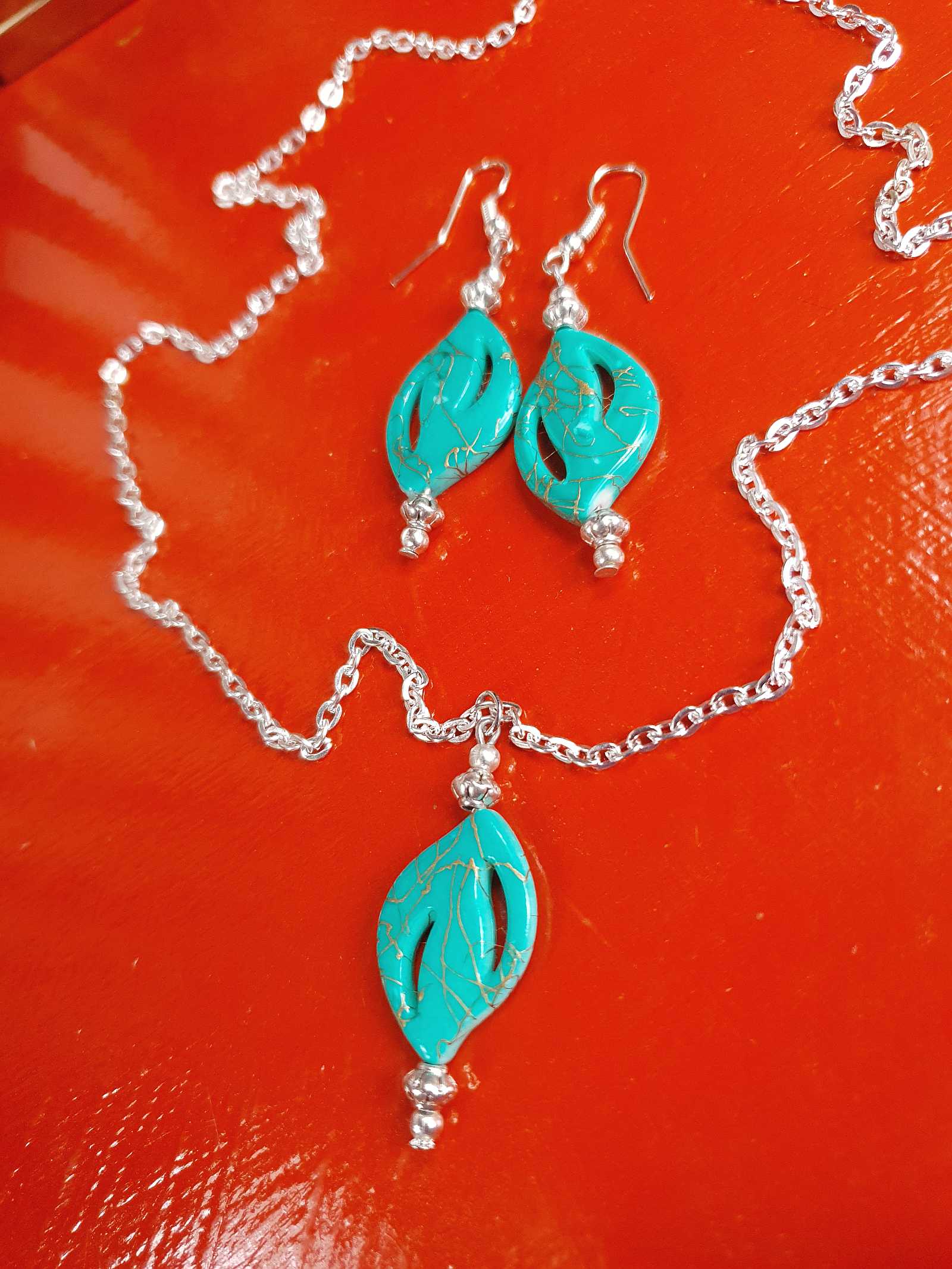 This vintage Y2K coordinated turquoise resin set features a necklace with a sculptural resin leaf pendant in vibrant turquoise with a painted gold abstract design, anchored by a polished bright silver-tone chain. Matching drop earrings for pierced ears.
